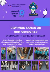 On Tuesday 12/11/24 we encourage learners to wear odd socks (2 different colours/patterns) to school in order to raise awareness that it is Anti-Bullying Week. Learners will do different activities during registration periods as part of the school’s Codi Llais programme to raise awareness to be respectful for everyone in line with the theme of the week: Choose Resect. For more information please visit: https://anti-bullyingalliance.org.uk/