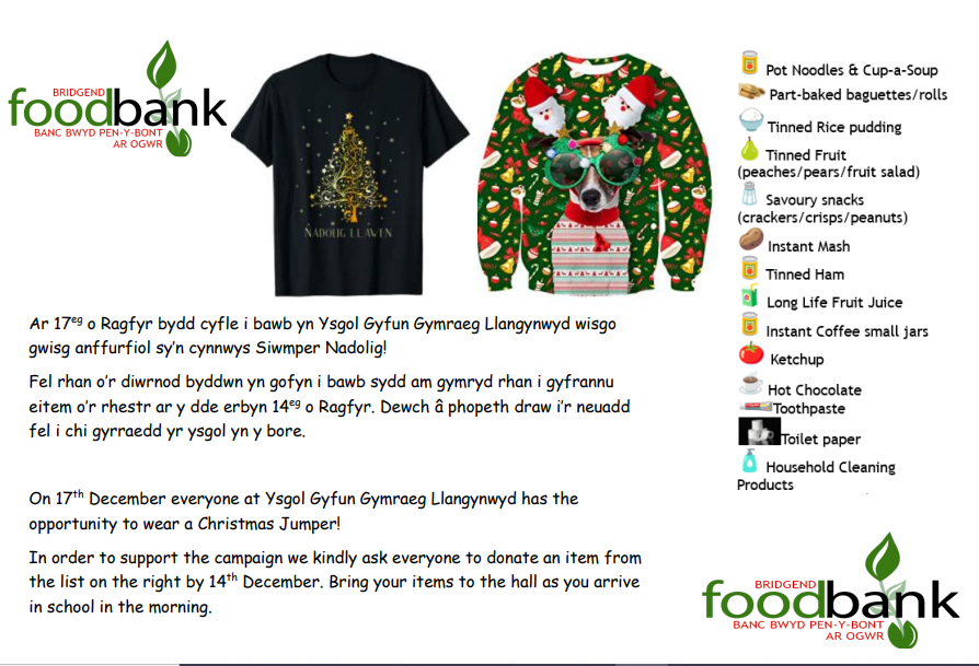 « All Events This event has passed. YGGLLAN: Christmas Jumper Day 17/12/2021 December 17, 2021 « YGGLLAN: Year 9 Virtual Parent’s Evening Wear Red for Wales and Velindre » Please see below a list of contributions that we would like for the Foodbank Add to calendar Google Calendar iCalendar Outlook 365 Outlook Live Details Date: December 17, 2021 Event Category: Ysgol Gyfan/Whole School